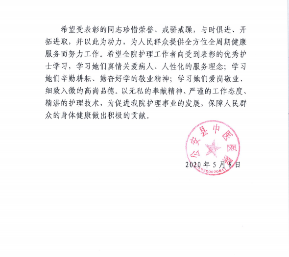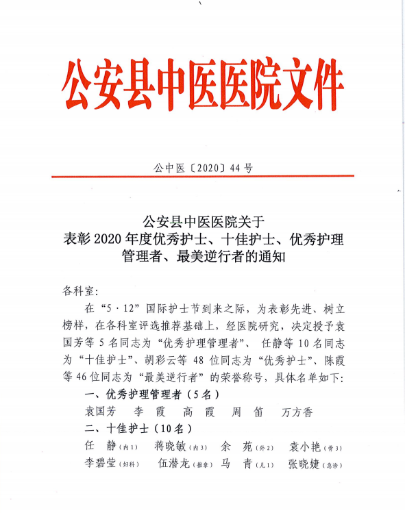 齐水涛,心血管内科护师。 作为一个年轻医务工作者,时刻严格要求自己,工作认真,护理病人细心周到,曾荣获全院护理操作技能比武第一名,“先进工作者”,在2020年新型冠状病毒肺炎疫情爆发初期,她就主动申请到隔离病区一线工作,疫情期间,她不畏艰险,义无反顾,积极参与疫情工作,为抗击疫情取得全面胜利贡献了自己的一份力量。 吴雅霜,内2科副护士长,护师。 曾先后获得“公安县技术操作能手”及医院“先进工作者”“优秀护士”等各项称号。积极参加医院组织的各项活动先后获得““中医基础理论知识竞赛三等奖”、“中医适宜技术推介赛第一名”及医院技术操作比武第一名等成绩。工作中总是以身作则,热情对待每一位患者,视病人如亲人。在2020年新型冠状病毒肺炎疫情期间,不畏艰险,舍小家为大家,积极参与隔离病区工作,为抗击疫情作出了自己的一份贡献! ◆ ◆ ◆ ◆ ◆ 袁小艳,骨3科护师。 多次被评为“十佳护士”、“先进工作者”和“优秀护士”。在十五年的护理岗位中她始终兢兢业业、任劳任怨、用优良的技术服务患者,虽默默无闻、但用心温暖感动着每一位病患。自新冠肺炎疫情开始,她和丈夫都在第一时间投身到不同的抗疫一线,她从一线隔离病区到门诊预检分诊,都留下了她忙碌的身影,并始终践行着一名医务工作者“不忘初心、救死扶伤’的使命。 ◆ ◆ ◆ ◆ ◆ 任静,神经内科护师。 从事临床护理工作13年,理论扎实,技能娴熟,具有丰富的临床护理经验。疫情开始时,她就主动请缨到隔离病区一线工作,那里工作特殊,任务重,但她兢兢业业,对待危重患者无微不至,多次参与危重患者抢救。在教学培训中以“言传身教”的方式将积累的经验传授给年轻护士,并不断的提高和完善自己的业务水平。她先后被评为“先进工作者”、“优秀护士”、“最满意护士”和“县抗疫三八红旗手标兵”。 ◆ ◆ ◆ ◆ ◆ 李淼,内3科护师。 2012年从事护理工作,工作中始终兢兢业业、任劳任怨,为提升业务技能工作之余坚持学习,工作得到了医院和患者的认可,期间多次被评为“优秀护士”、“十佳护士”、“优秀教学组长”;面对新型冠状病毒肺炎疫情,她主动请缨毫不退缩,2月1日参加抗击疫情工作,在医院隔离病区,她时刻保持着“工作雷厉风行、服务热情似火”的工作作风,即使抗疫工作繁杂、防护服笨重致呼吸不畅,她也只是停下来缓了缓,等调整过来后又立即投入到抗疫工作中。新冠肺炎疫情没有阻挡到她工作的脚步,笨重防护服没有熄灭她服务的热情,她在工作中踏着坚实的步伐,践行着一个医务工作者“不忘初心,救死扶伤”的使命。 ◆ ◆ ◆ ◆ ◆ 胡彩云,内6科护师。 在7年的护理工作中,她任劳任怨,兢兢业业,虽然话不多,但她用实际行动温暖感动着每一位患者。多次荣获“优秀护士”、“先进工作者”等荣誉称号。2015年,因在夹竹园街上抢救昏仆倒地的老人,经媒体网络报道后被誉为“最美护士”。面对疫情,不畏艰辛,不惧危险,第一时间主动请战,多次参与危重患者的抢救与护理,对待患者无微不至,对待工作兢兢业业,得到患者和同事的一致好评,是我们学习的榜样和楷模。